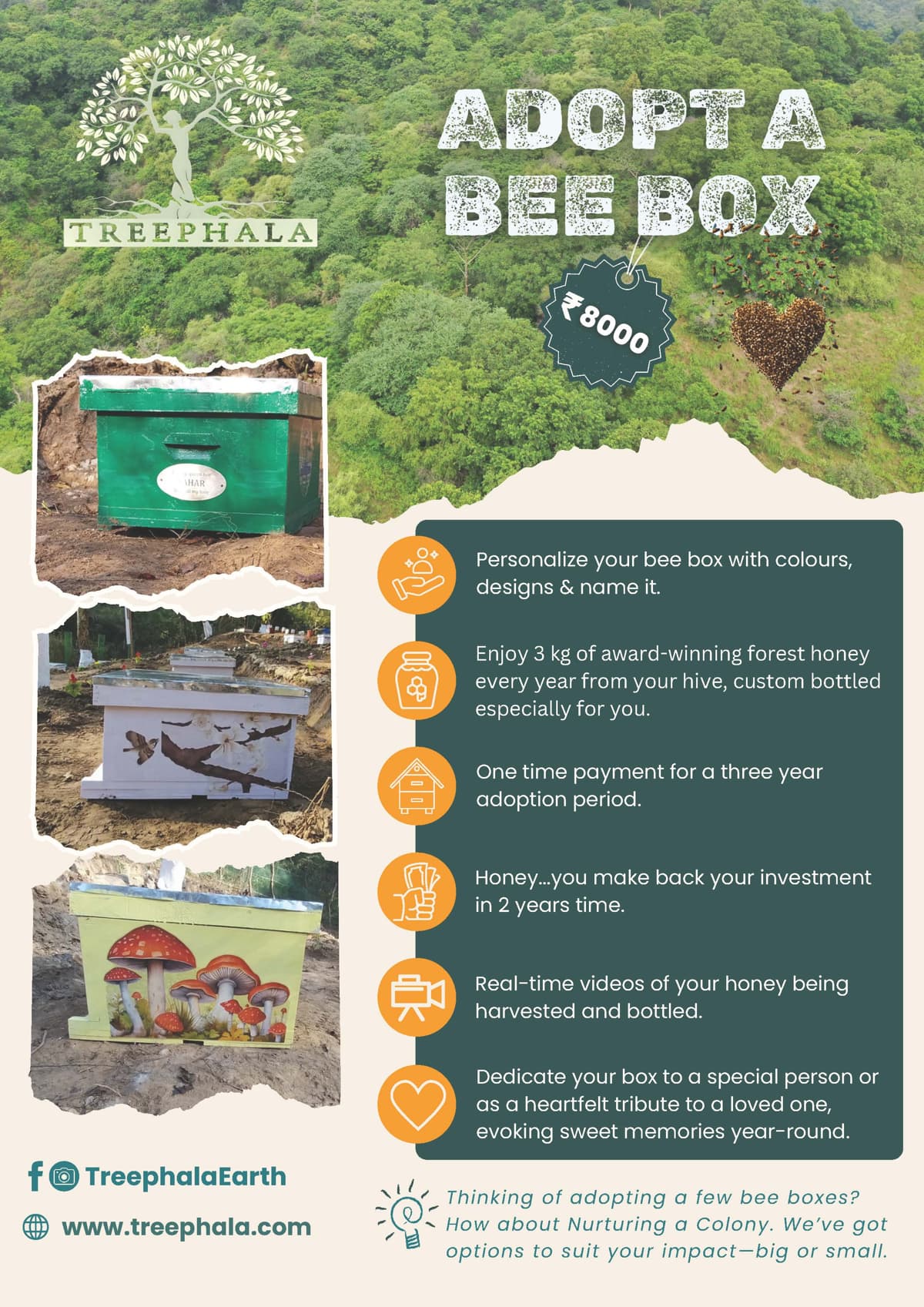 By giving bees an environment to thrive—and we’re doing just that. At Treephala Earth, we’re using our privately owned forest in Punjab to create a sanctuary for bees. We’ve already installed 250 bee boxes, and our 2025 goal is 1,000 boxes—creating a flourishing home for 30–50 million bees. These bees won’t just pollinate the forest; they’ll keep nearby farmlands alive, ensuring food security and ecosystem balance. But we can’t do it alone. We need you! And if you like honey, you’re going to love this. To reach our target of 1,000 bee boxes, we are offering you a rare opportunity to Adopt a Bee Box and receive a share of pure honey from your hive through the year. See below for further information.